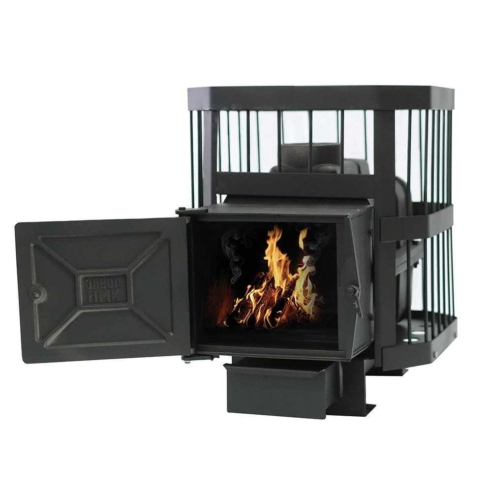 Новая чугунная банная печь "Сибирь-15" в производственной линейке завода "НМК", рассчитанная на обогрев парильного и смежных помещений объемом от 8 до 15 м3.