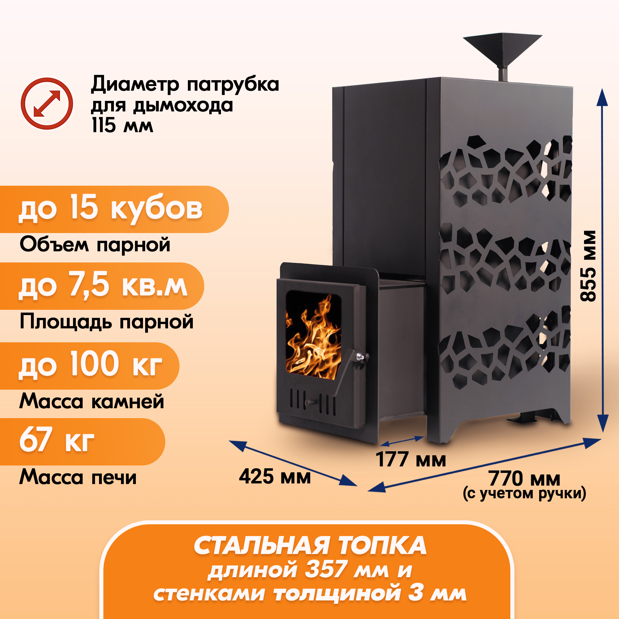 Эффективное расположение открытой каменки прямо над верхней частью топочной камеры позволяет быстро и эффективно нагревать камни, что обеспечивает нужную температуру и пар в парной.