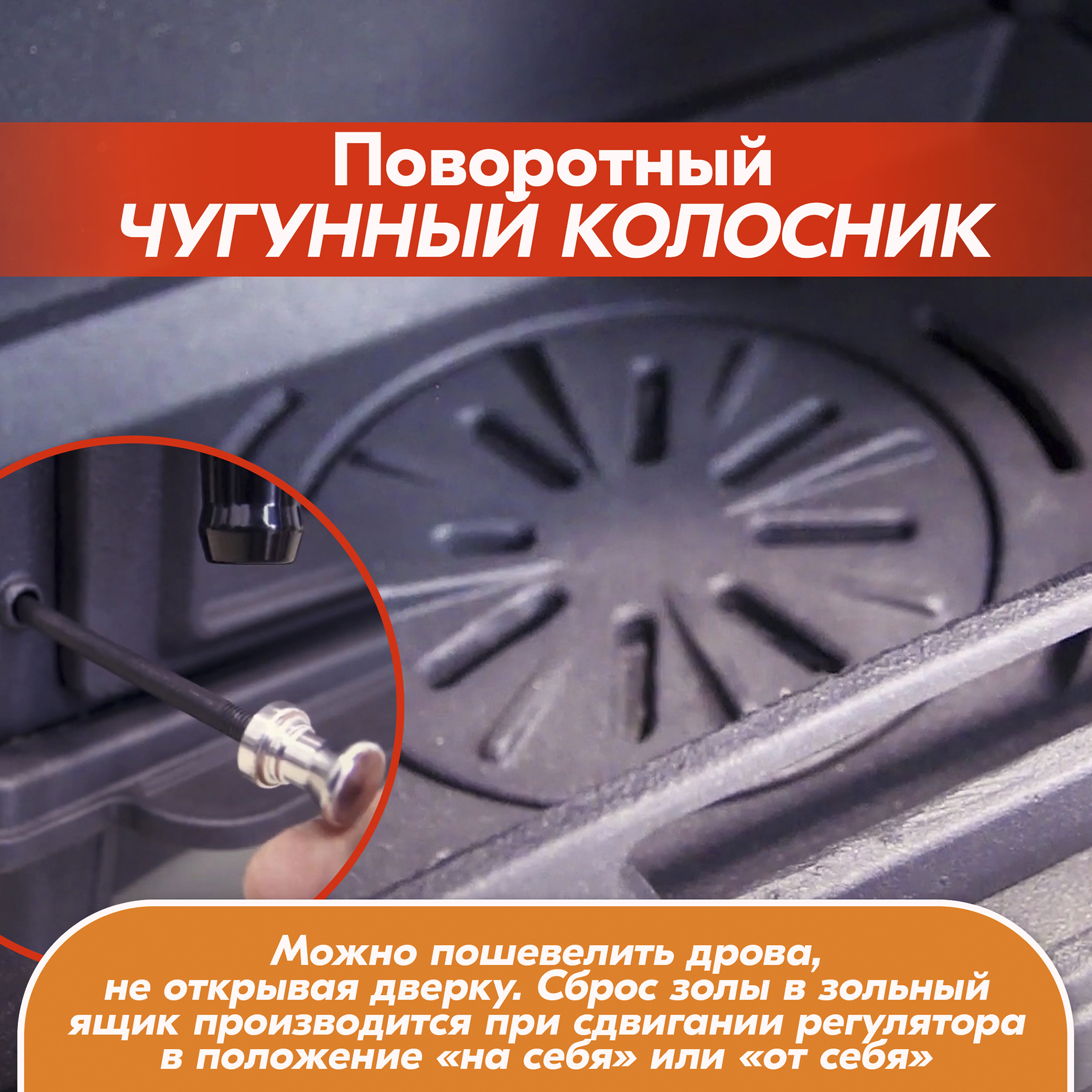 В конструкцию чугунной печи-камина внедрена система дожига вторичных газов, которая обеспечила высокий КПД камина 79% и умеренный расход топлива.