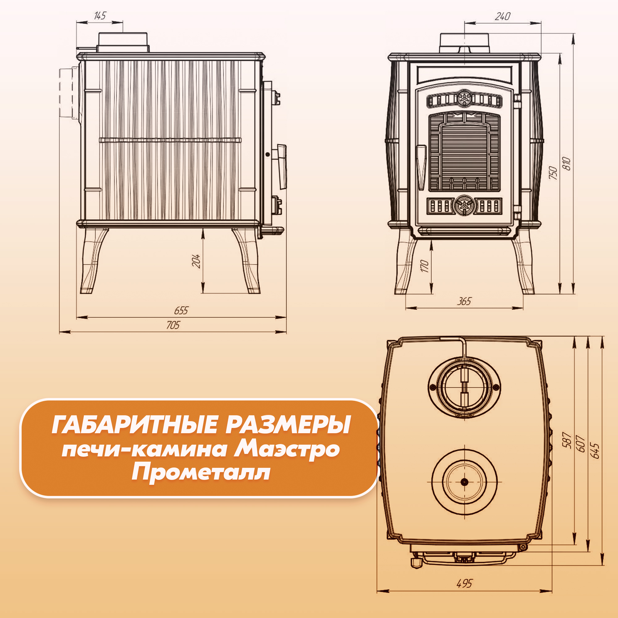 Печь-камин Прометалл Маэстро – это стильная, надежная и функциональная печь из чугуна, сочетающая в себе максимум достоинств: быстрый нагрев помещения, высокую теплоотдачу, герметичную конструкция и длительное горение в режиме тления.