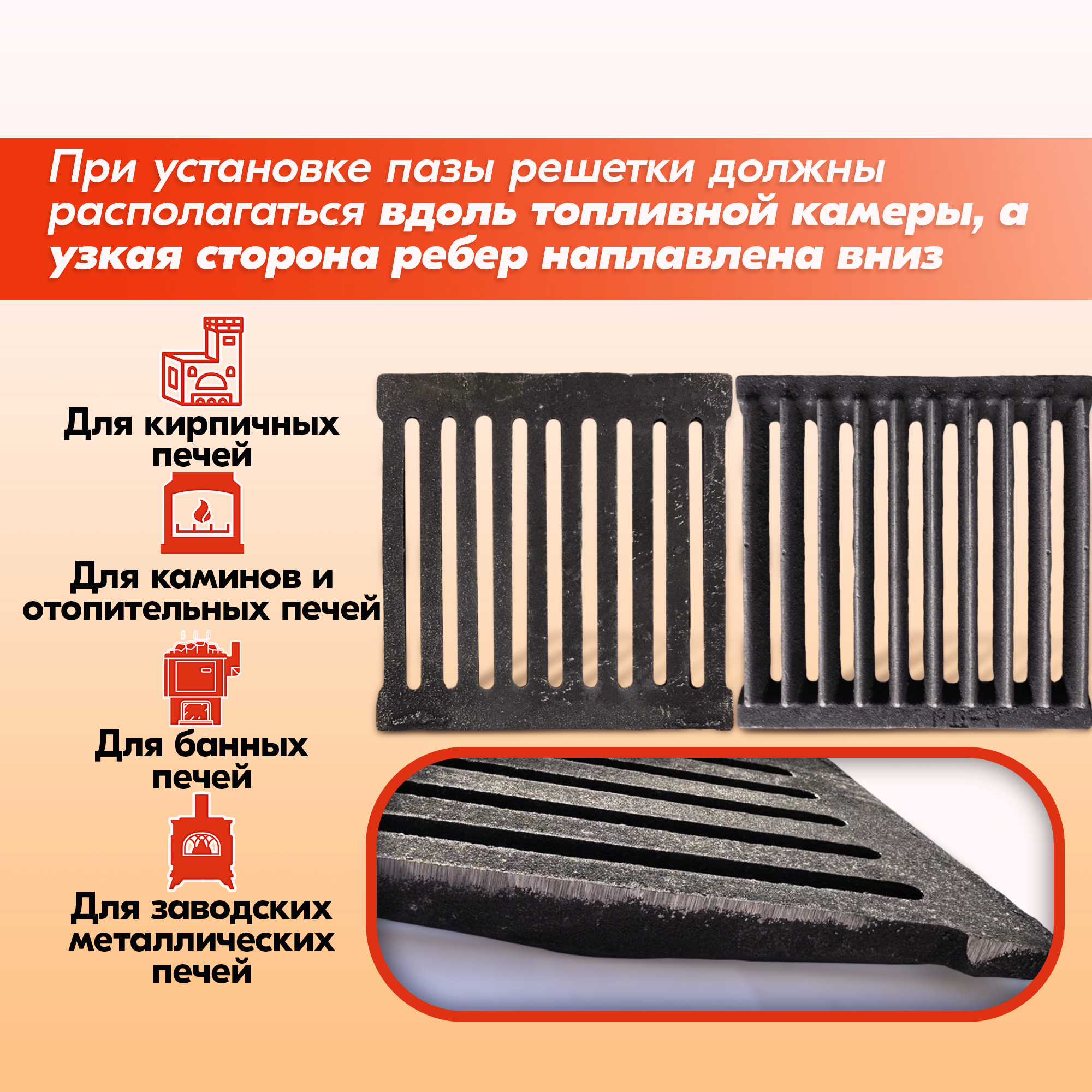 Колосник нужно устанавливать узкой стороной рёбер вниз, в противном случае срок его службы значительно снижается.