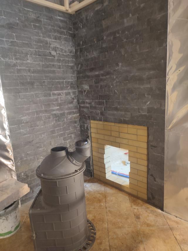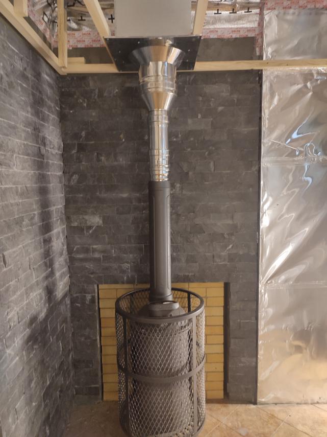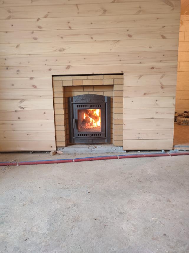 Монтаж печи Атмосфера с установкой коплекта дымохода и кирпичного портала.